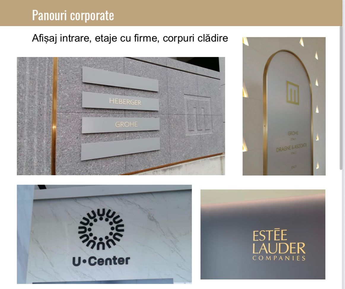 • Panouri corporate – pentru birouri și spații comerciale, cu logo gravat sau sablat;