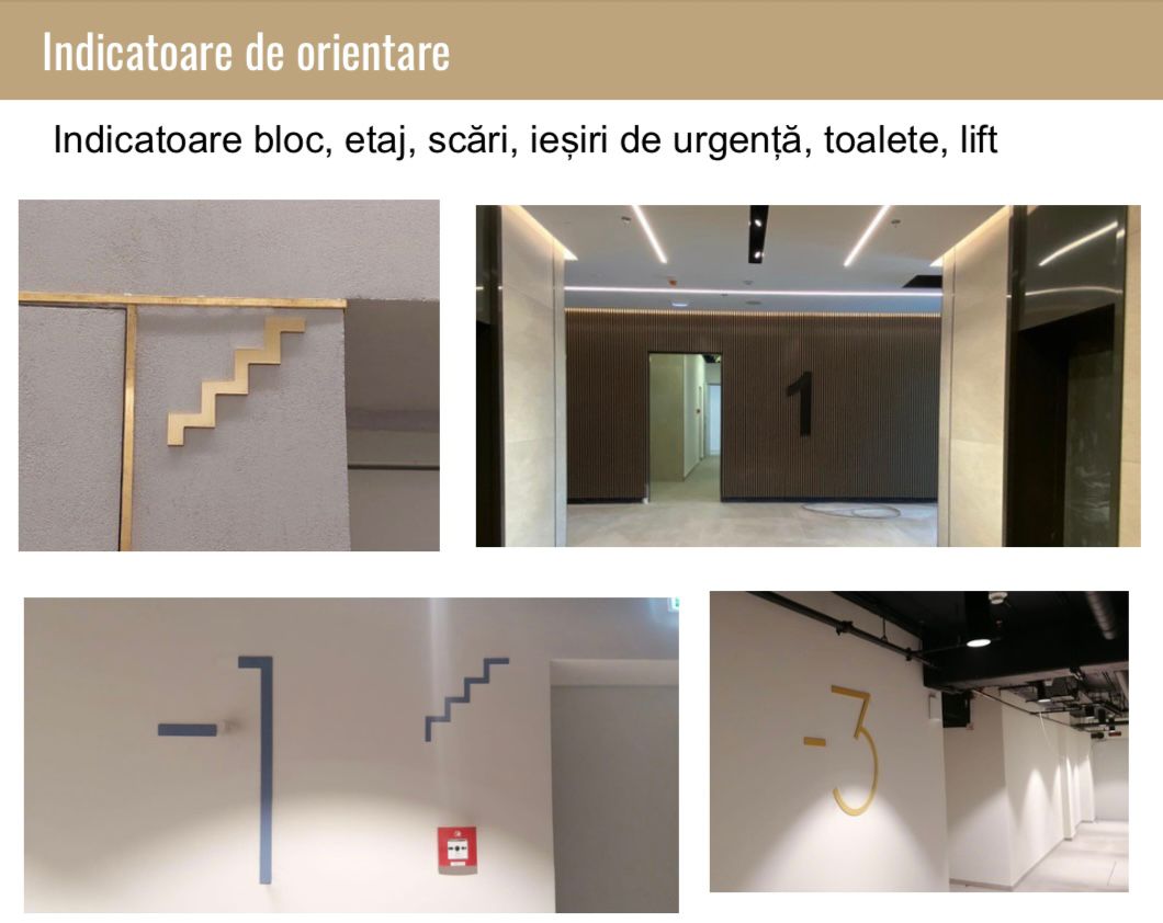 • Indicatoare de orientare – etaje, scări, lifturi, ieșiri de urgență;