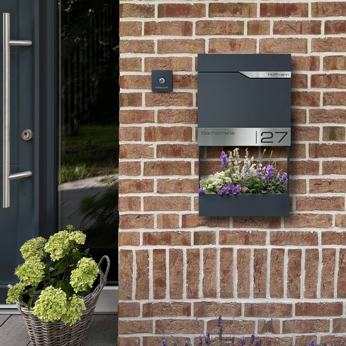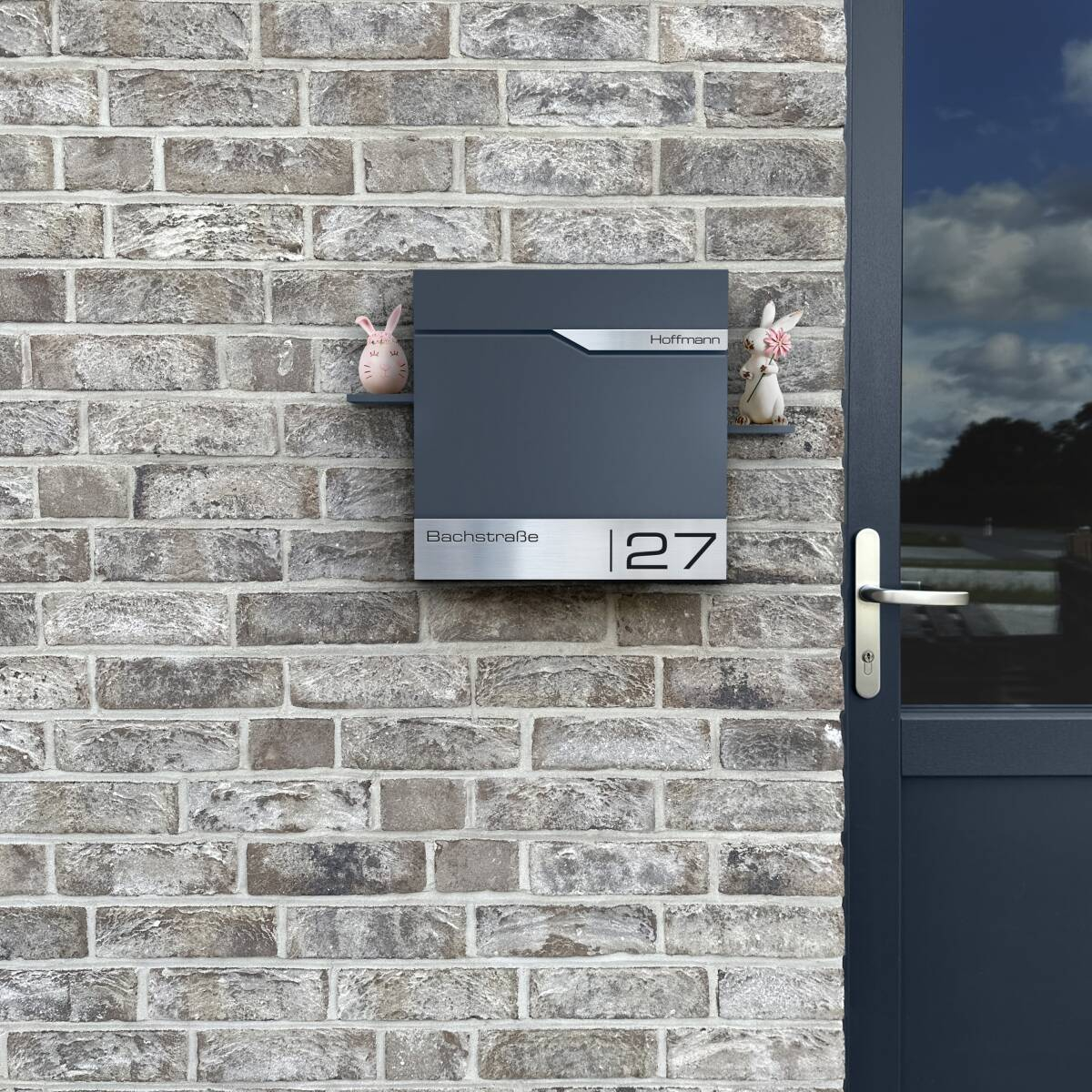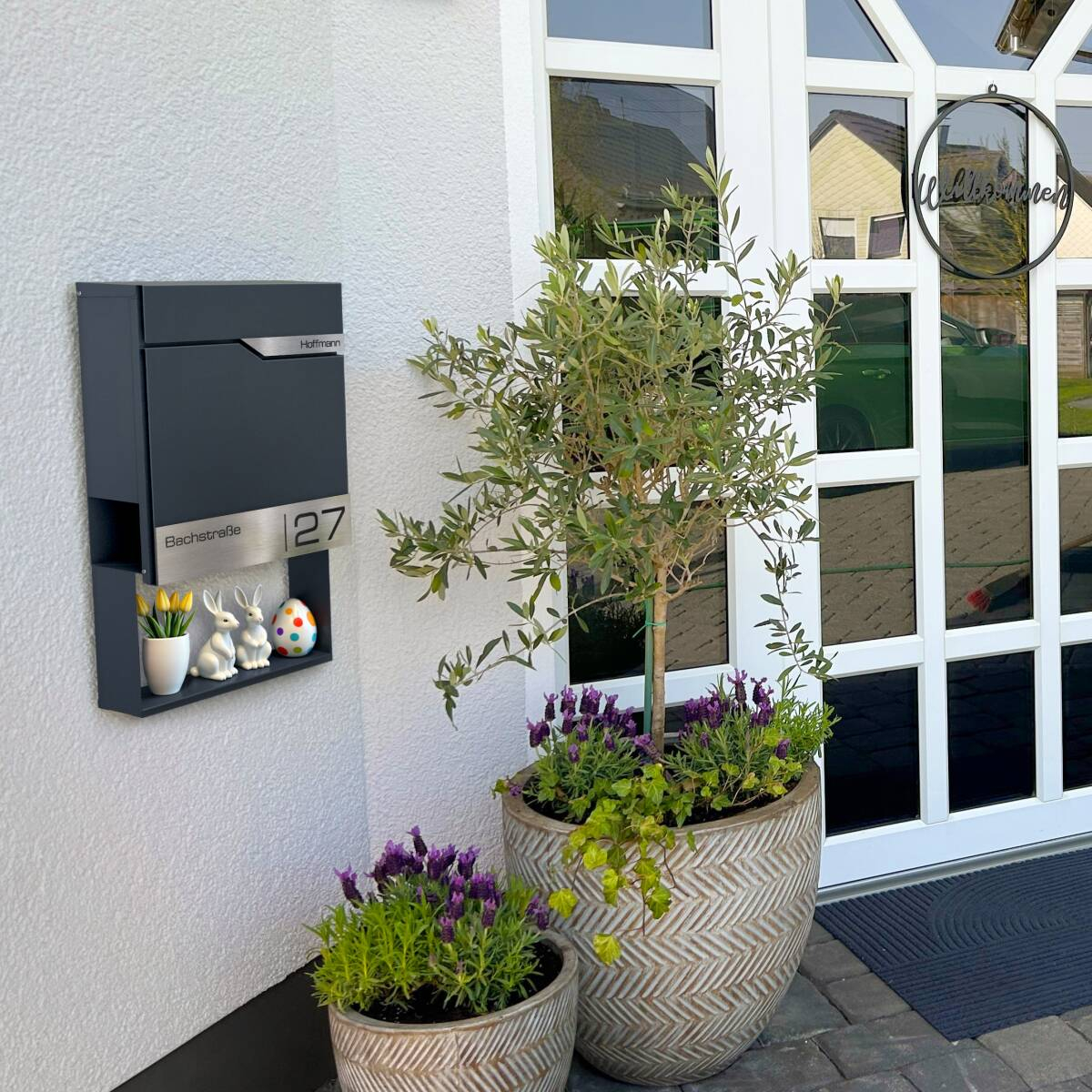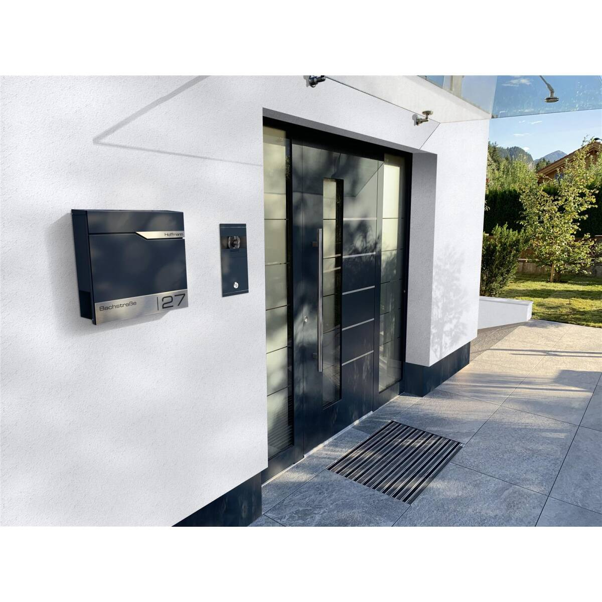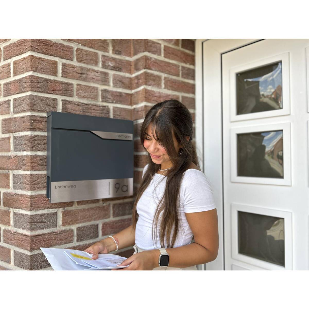 Cutie poștală Siebert cu suport pentru ziare și semne din oțel inoxidabil Un must-have pentru intrarea acasă. Cutia poștală este fabricată din oțel solid de calitate superioară. Pentru a face cutia poștală și mai rezistentă la intemperii, oțelul este acoperit cu vopsea în câmp electrostatic în antracit RAL 7016 după ce numărul străzii și al casei au fost tăiate cu laser. Acest finisaj oferă o protecție excelentă împotriva intemperiilor cutiei poștale. Gravura Fâșiile de gravare din oțel inoxidabil ies în evidență în mod deosebit la acest model de cutie poștală. Puteți avea numele gravat pe partea de sus, semn autoadeziv. Al doilea panou din oțel inoxidabil poate fi prevăzut cu numele străzii și numărul casei. Puteți alege dintre douăzeci de fonturi selectate și puteți oferi căsuței dvs. poștale o notă individuală. Și dacă există modificări, puteți schimba cu ușurință insigna de nume cu insigna de înlocuire de la noi în orice moment (numărul articolului 28699). Funcționalitate Cutia poștală reprezintă o eleganță simplă asociată cu o funcționalitate excelentă: compartimentul pentru ziar este complet integrat și poate fi umplut cu ușurință din ambele părți. Clapa de inserție cu design generos, care măsoară 335 x 35 mm, ține și plicuri DIN A4 fără a le șifona. Pentru un aspect general armonios, încuietoarea cutiei poștale este acoperită elegant de clapă. Acest lucru face din cutia poștală o adevărată atracție în zona de intrare! Funcții excelente ale cutiei poștale construcție robustă și durabilă din oțel solid, de calitate superioară rezistent la coroziune și intemperii Placă de gravare: oțel inoxidabil V4A Finisare: Vopsea vopsea pulbere în câmp electrostatic în culoarea modernă antracit RAL 7016 mat 100% rezistent la UV și intemperii Fanta largă pentru introducerea corespondenței: plicurile DIN A4 pot fi de asemenea introduse cu ușurință Tip de montare: montare pe perete Eticheta de nume din oțel inoxidabil poate fi înlocuită în orice moment (etichetă de înlocuire sub articolul nr. 28699) incl. Material de fixare incl. 2 taste pentru cutia poștală Produs de calitate MimoElvo Dimensiuni (înălțime x lățime x adâncime): 370 x 370 x 105 mm Inserați slot: 335 x 35 mm