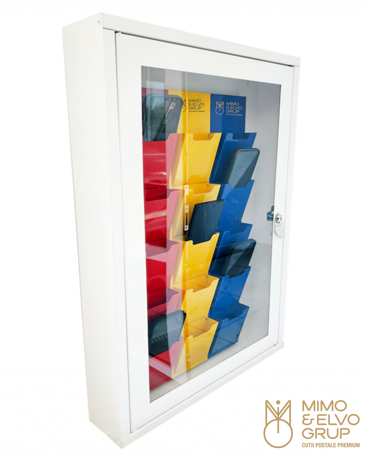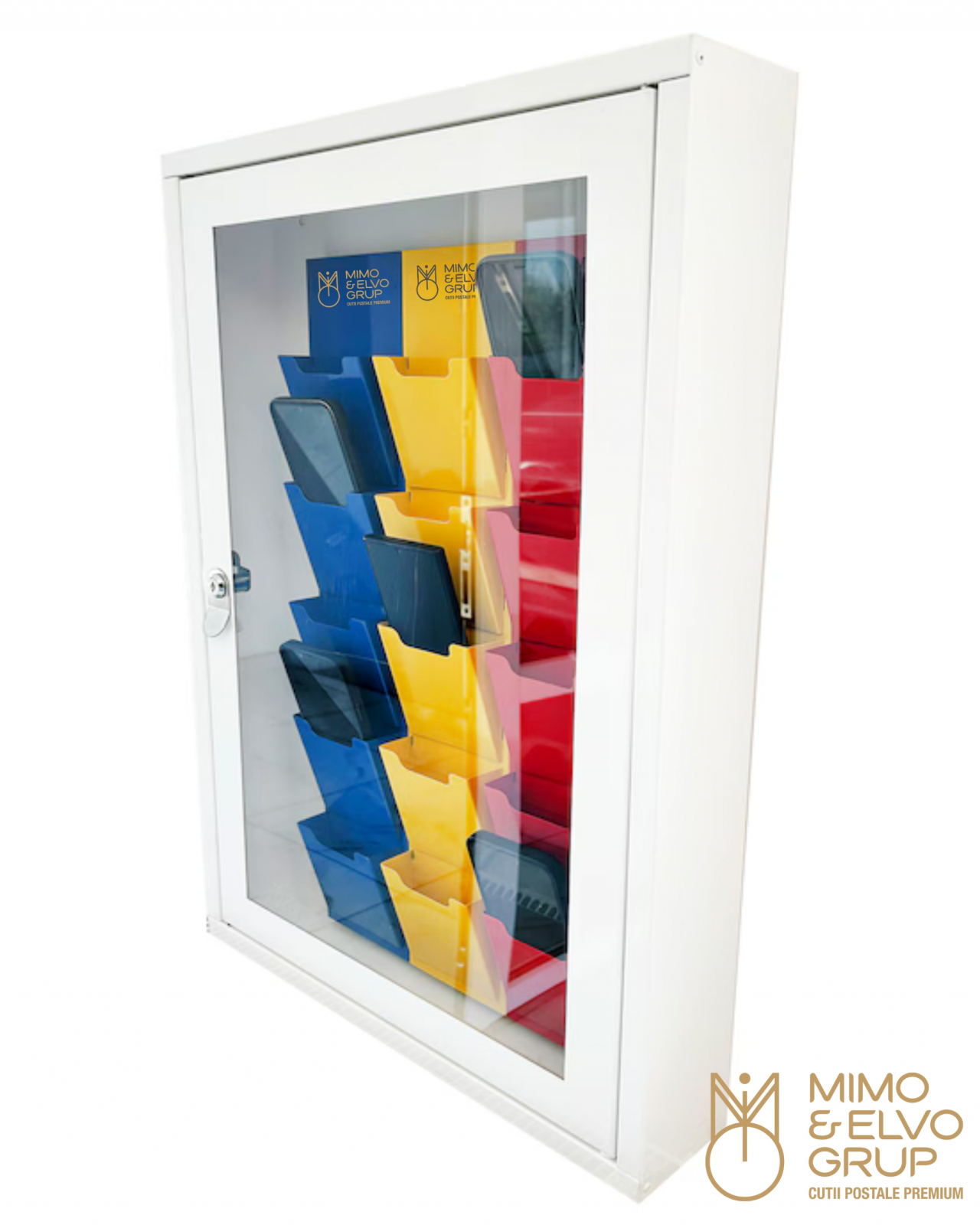 Cutie metalică pentru depozitarea în siguranță a telefoanelor mobile, cu 15 compartimente individuale și ușă cu încuietoare. Soluție ideală pentru școli, instituții publice, birouri sau spații în care se restricționează utilizarea dispozitivelor mobile.